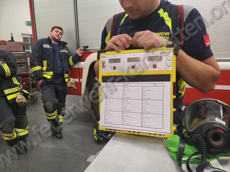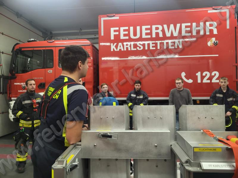 Zu Beginn wurden verschiedene Taktiken besprochen, wie eine Schlauchleitung im Atemschutzeinsatz optimal verlegt werden kann. Anschließend wurde einer unserer neuen Rollcontainer vorgestellt und dessen Aufbau sowie Einsatzmöglichkeiten erläutert. Danach wurden alle Geräte durchgegangen, die im Atemschutzeinsatz benötigt werden könnten. Dabei konnten viele Fragen geklärt und wertvolle Tipps für den praktischen Einsatz vermittelt werden.