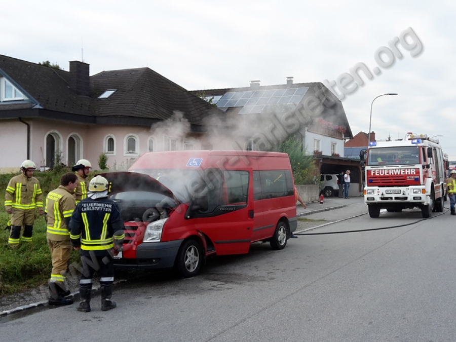 Am 21.09.2016, um 07:44 Uhr, wurden die Freiwilligen Feuerwehren Karlstetten, Neidling, Hausenbach und Waitzendorf zu einem Fahrzeugbrand in Afing alarmiert. Minuten später trafen die ersten Feuerwehrkräfte am Einsatzort ein und es konnte der Fahrzeugbrand eines Taxibusses festgestellt werden. Mittels HD-Schnellangriffseinrichtung wurde das Feuer im Motorraum gelöscht. Die weiteren eintreffenden Feuerwehren blieben in Einsatzreserve, von der ebenfalls am Einsatzort eingetroffenen Polizeibeamten der PI Prinzersdorf wurden die Erhebungen zur Brandursache getätigt. Die Einsatzkräfte der FF Karlstetten rückten nach kurzer Zeit wieder in das Feuerwehrhaus ein.